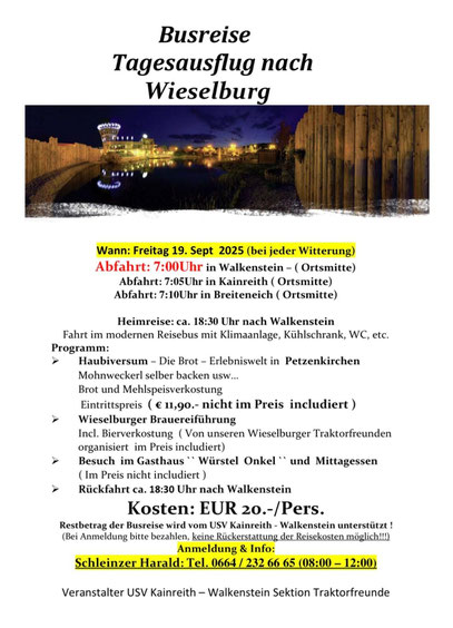 Zu Beginn wurde das Eisenbahnmuseum in Sigmundsherberg besucht - Obmann Rupert Öhlknecht übernahm die Führung persönlich. Anschließend wurde der Traktorstadl in Walkenstein besucht bevor es zum Mittagessen ins Gasthaus Koch nach Kainreith ging. Pressesprecher und Kassier Rudi KEUSCH übernahm die Leitung der Begrüßungsdelegation und vermittelte allen Teilnehmern den Werdegang des Vereines bzw. die Entstehung und Entwicklung der Sektion der USV Traktorfreunde.