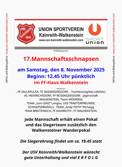Das Mannschaftsschnapsen wurde im Jahre 2007 installiert. Als Wanderpokalsponsoren konnte der Initiator und Ehrenverwalter der FF Walkenstein Karl SCHLEINZER Ortsvorsteher Karl LIEBHART sowie Bürgermeister Franz GÖD überzeugen.